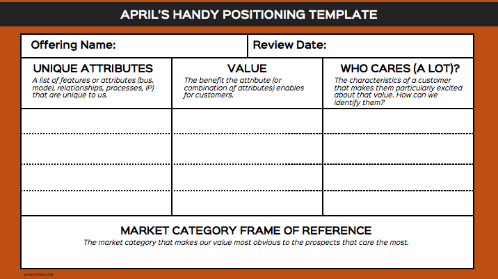 April Dunford’s method: anchored in how customers perceive you, framed around category entry points, tested rigorously and iteratively until it resonates.